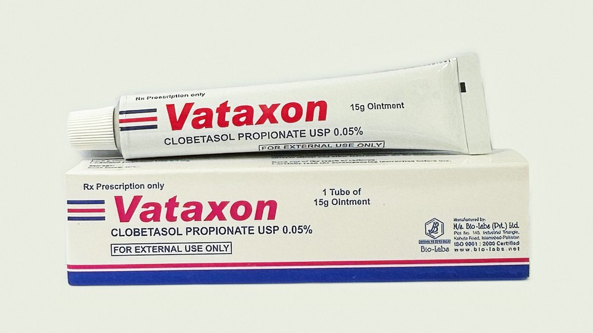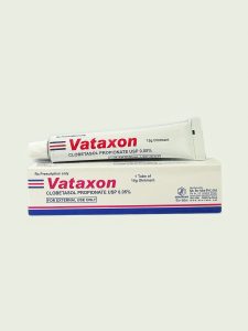 Thuốc Vataxon là thuốc được bào chế dưới dạng mỡ bôi ngoài da với thành phần chính là Clobetasol Propionate, một corticoid mạnh nhóm I. Thuốc được dùng để điều trị các bệnh da liễu như vảy nến, chàm da dai dẳng,…