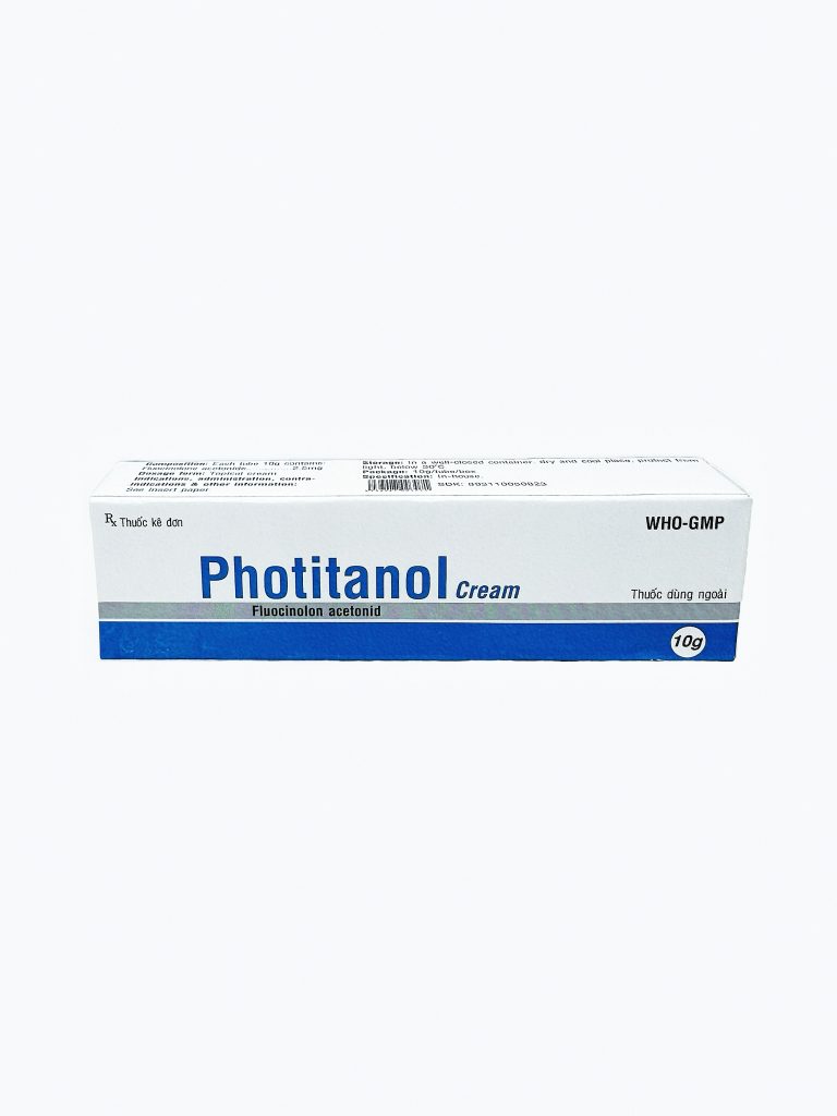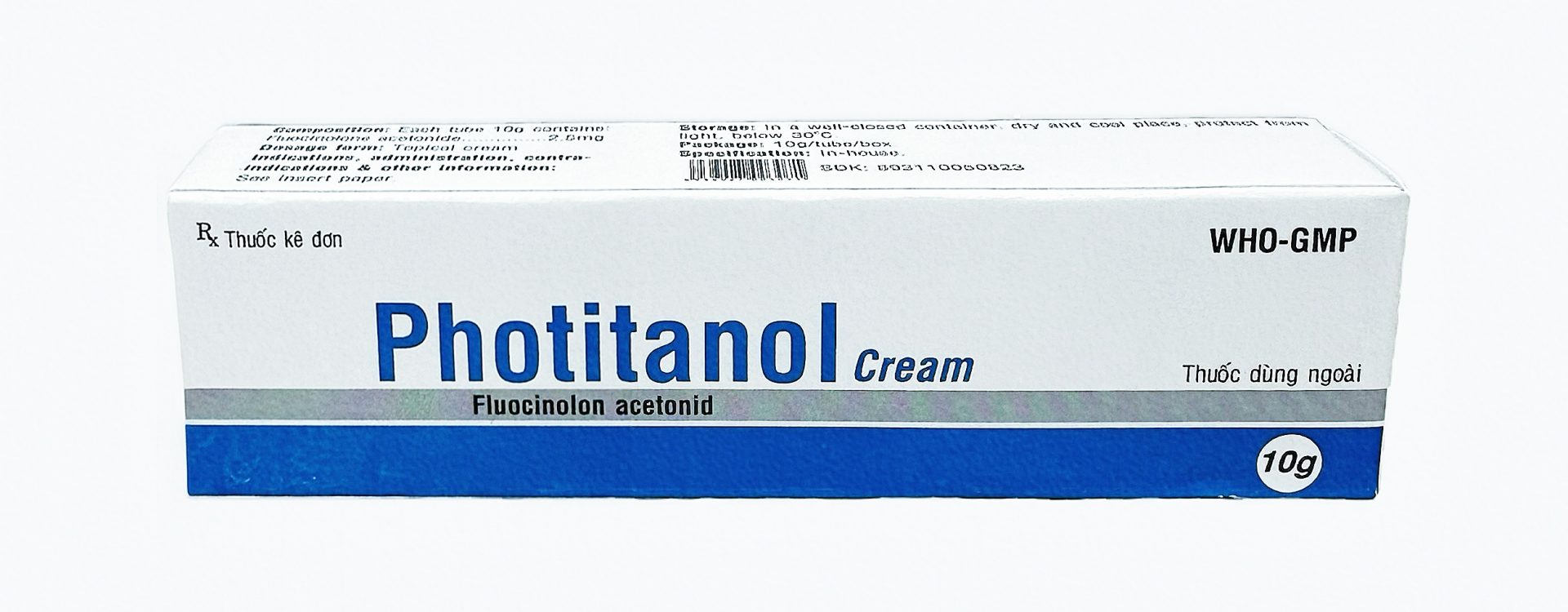 Thông tin thuốc bôi da Photitanol I. Thông tin sản phẩm Tên thuốc: Photitanol Hoạt chất: Fluocinolone Acetonide hàm lượng 2,5 mg Tá dược: vừa đủ